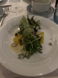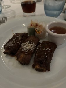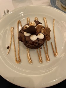 Pictured above was my dinner…. Asian Pork Spare Ribs (really good), Cheese Ravioli in a “Lobster Cream Sauce” (good, but not a cream sauce – more of a broth), not picture – White Cheddar Potato Soup (good), Pear and Gorgonzola Salad (excellent), S’more Brownie (excellent), and Bananas Foster (this was not good, at all).