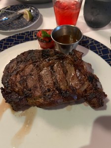 It was not the best end to our visit, but it was the smartest choice. As soon as we stepped back on the ship, the sky fell out and it started storming like crazy. We all took showers and got ready for our 5:30pm reservation at Cagney’s Steakhouse.