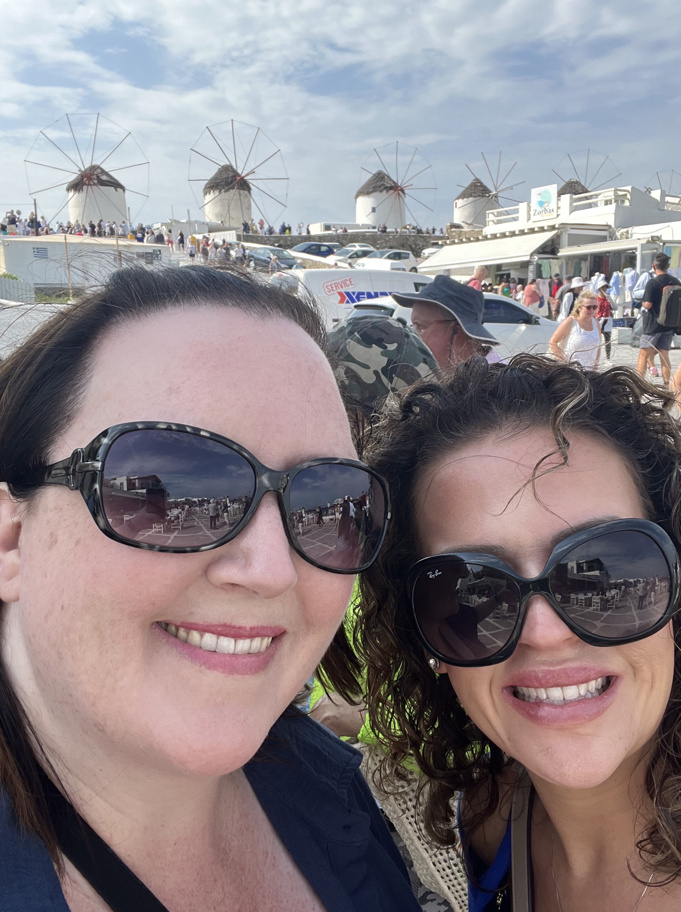 Tour next stop in Greece was another one of my Bucket List ports…. Mykonos! I was so excited. It was an early one, waking up at 6:15 and getting ready for the day’s adventure. I met Mom and Jeff for breakfast. Megan was running behind, so Mom grabbed her an omelet to scarf down before we had to get off the ship.
