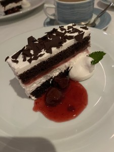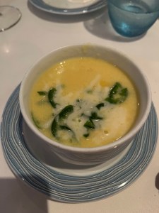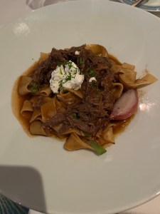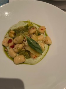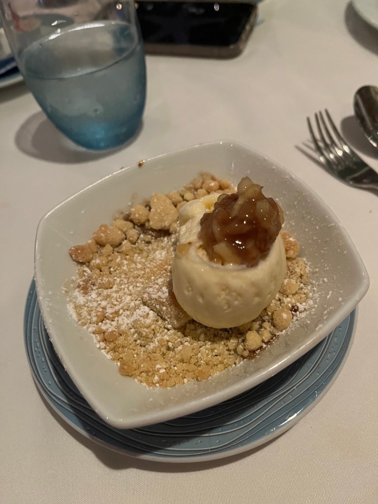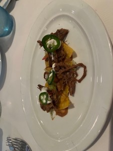 Pictured above was my dinner…. Mini Beef Tostadas (Good, but they were basically three loaded nachos); Sweet Corn and Pepper Bisque (Excellent, but mine had a LOT of diced jalapeños, so I couldn’t finish it); Braised Beef Ragu on Parpadelli pasta (beef and ricotta were excellent, didn’t eat the noodles); Pesto Gnocchi (really goo)d; Black Forest Cake (Good); Fig and Apple Cobbler with Ice Cream (really good).