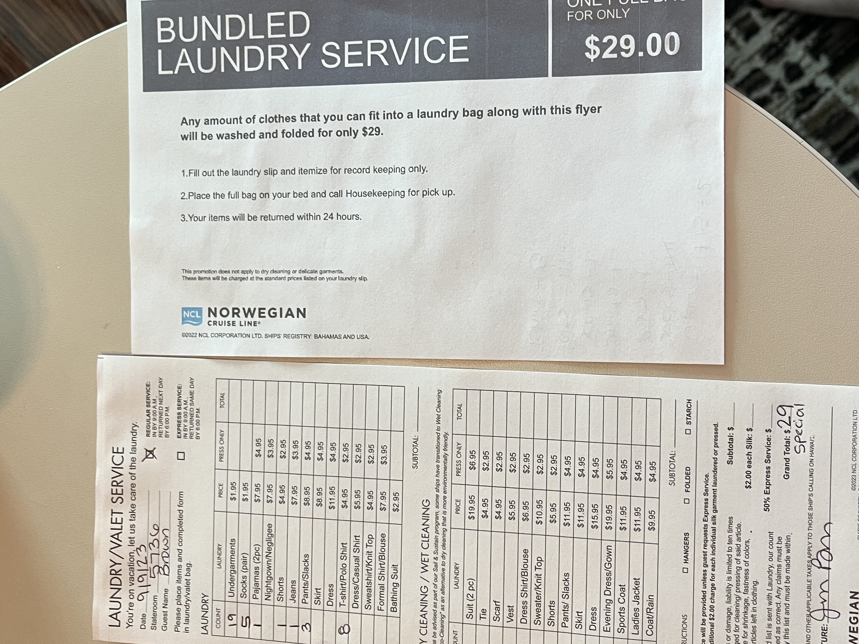 I got ready for the day and then got my laundry ready to be sent out. NCL was offering a special – $29 to fill a bag. Everyone in our group decided to take advantage of this offer. We made a game out of seeing who fit the most items in our bag. Megan won with 39 articles of clothing! I managed 38.