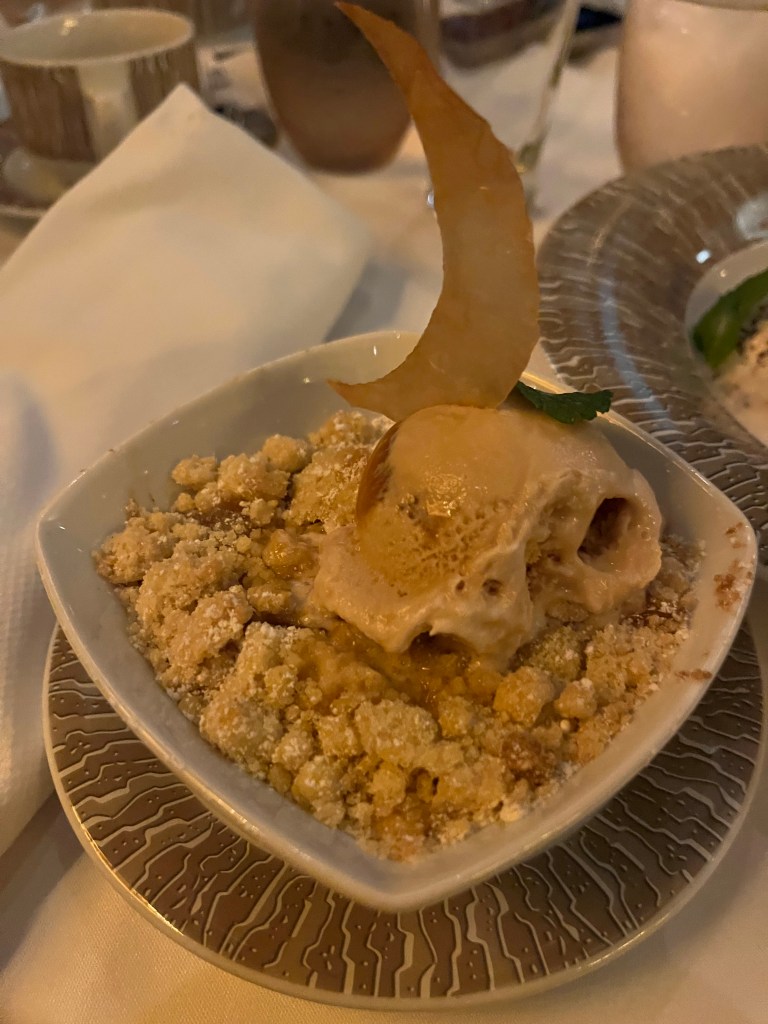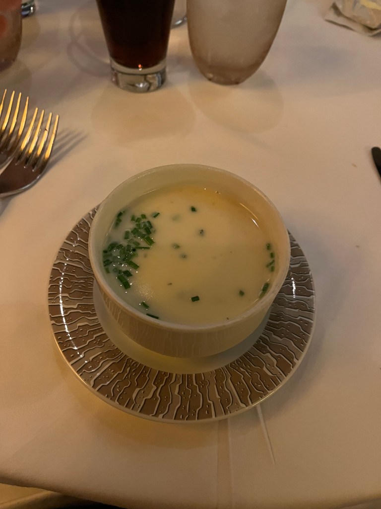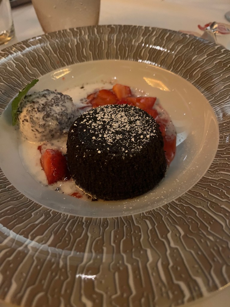 Pictured above was my dinner…. Scallops (Good but a little overcooked); Stilton Cheese Soup (Phenomenal); Not Pictured – Roasted Vegetables and Goat Cheese Salad (Really Good); Whole Roasted Beef (Ok); Lava Cake (Good); and Apple Cobbler (Good).