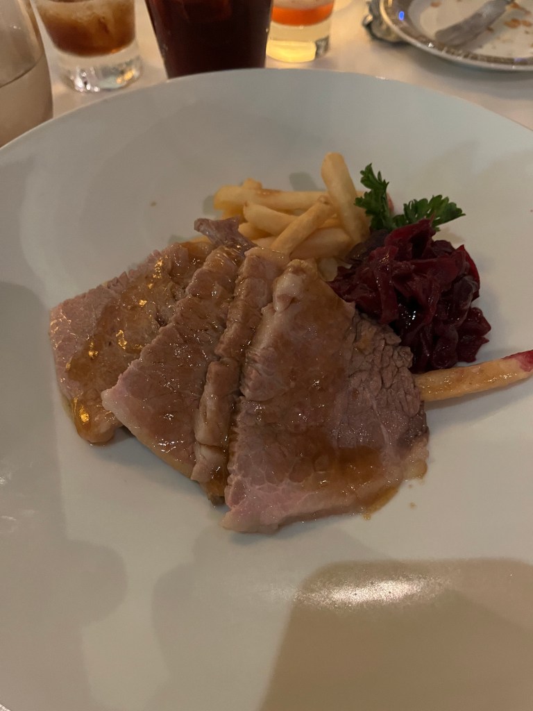 Pictured above was my dinner…. Cheese Tortellini Soup (Good, but it was chicken noodle soup not cheese tortellini); Not Pictured -Mixed Green Salad (Good); Braised Beef Brisket (Good, but not what I expected); and Chocolate Raspberry Torte (Good).