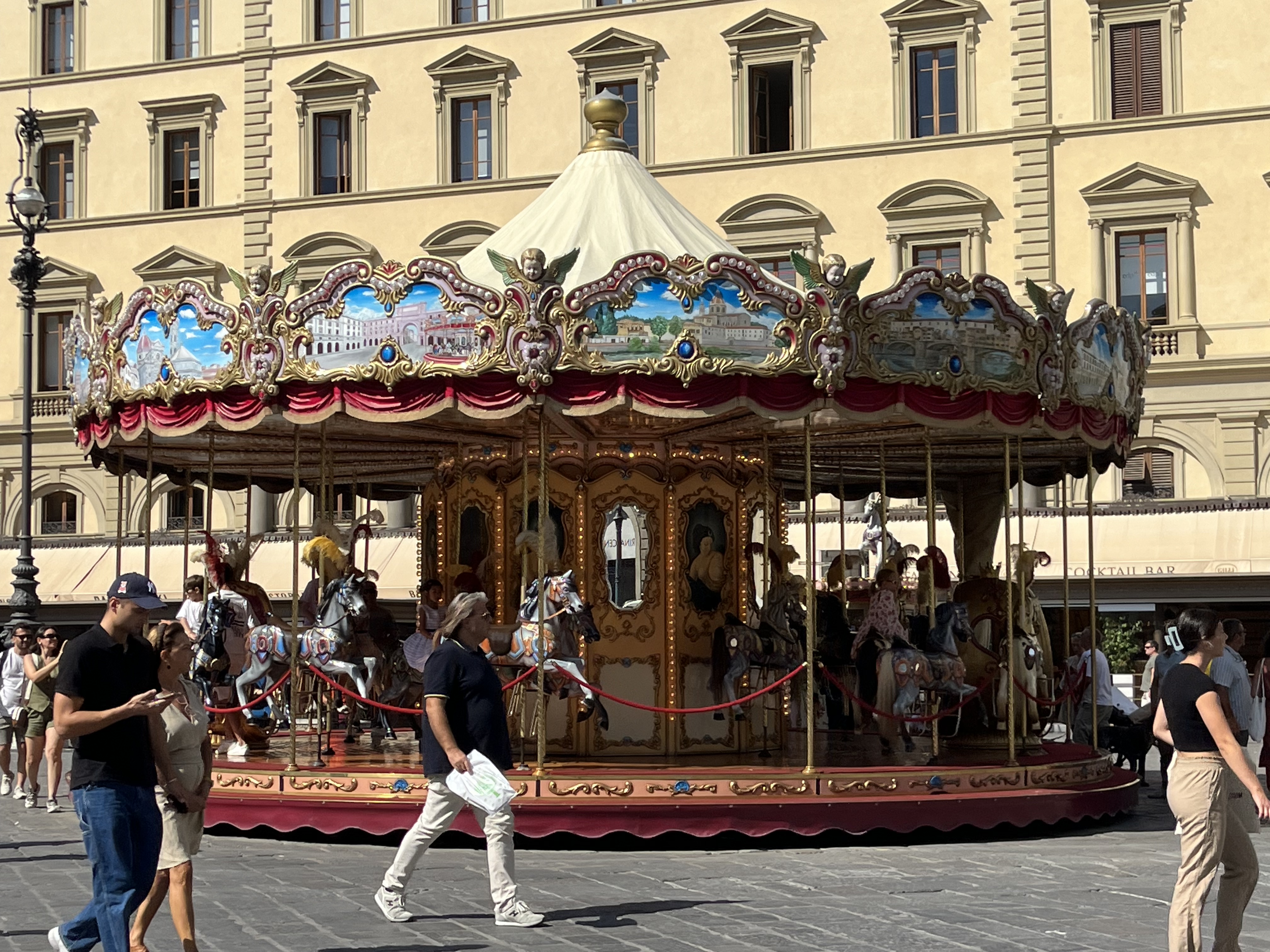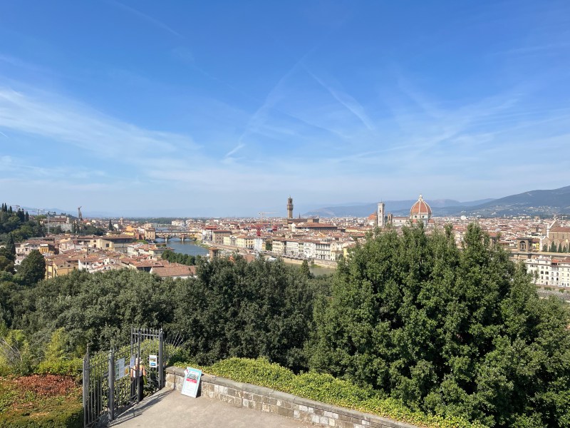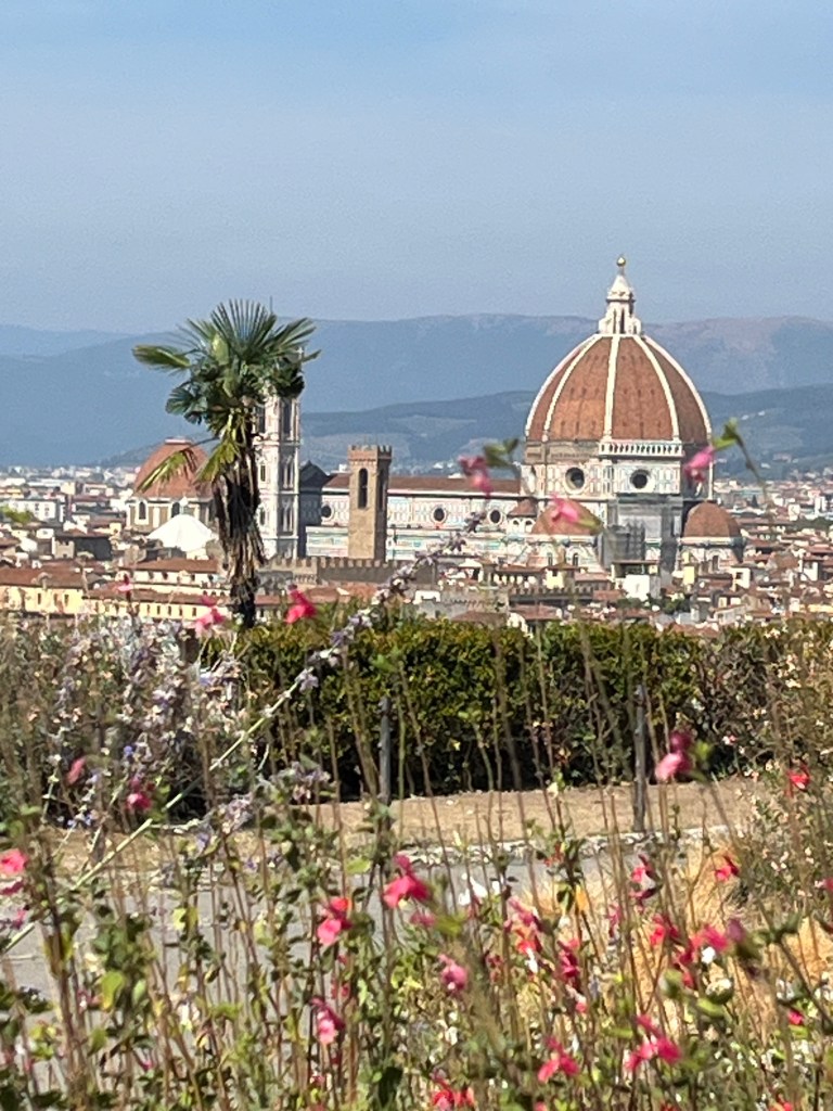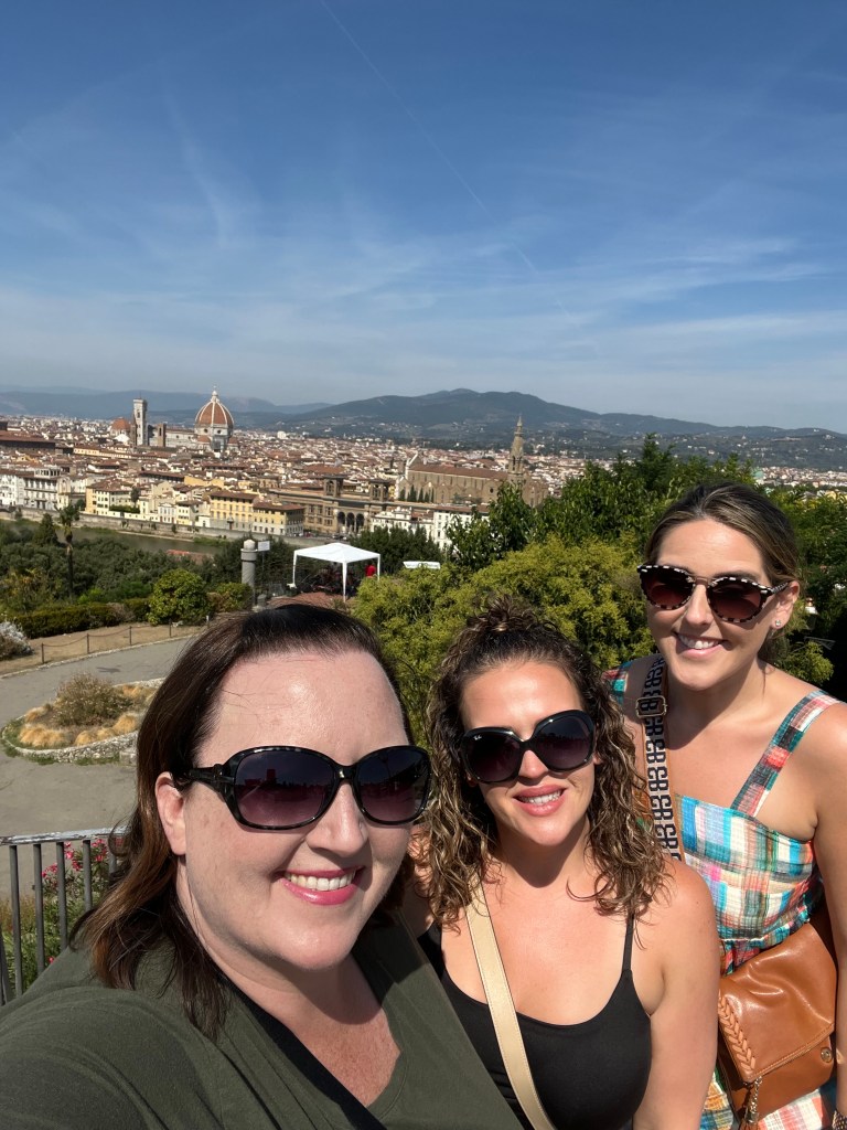 We took our photos, found our souvenirs, rescued Jeff from the “free” roses and bracelets, and got on our way. Again, Massimo did an excellent job of engaging us with information about the area. We made our way to Florence. Massimo took us to a square at that was overlooking the city. We took about 15 minutes to take photos, use the restroom, and get a drink.